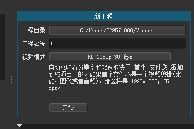 选择存放工程的目录,设置工程名称(个人随意设置),选择视频模式,点 【开始】 后新的工程就建好了。